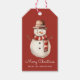Lägg till en festlig touch till dina högtidspresenter och julfirande med våra rustika snömannen presentetiketter. Presenetiketterna visar en vattenfärg snöman som bär en brun vinterhatt med en röd och vit halsduk. Personifiera de söta snömannen presentetiketter med en anpassad hälsning (för närvarande visas som "God Jul") och ditt namn i vit text. Baksidan av etiketten visar en mörkröd bakgrund med subtila vita prickar
