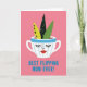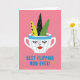 Designad med en ljus, modern illustrationsstil centrerar kortet kring en vit mugg med mjuka blå vertikala ränder och en kraftfull blå kant. Muggen har slutna ögon med långa ögonfransar och en liten röd mun, vilket ger den ett sött, tillgiven utseende som känns som en tyst förälskelse ❤️. Tre bladformade figurer reser sig ur muggen som en vänlig bukett: en är limegrön med svarta runda fläckar, en är mycket mörkgrön med dämpade grågröna prickar och en är enfärgat mellan grön för balans. Bakgrunden är en kraftfull bubblegum rosa som får muggen och bladen att sticka ut och tillför en flirtig, glad energi. Nära nederkanten sitter ett kort meddelande centrerat i tjocka blå bokstäver och fungerar som ett stadigt ankare under bilden. De enkla formerna och den täta grupper