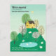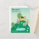 Söt och bedårande illustration av ett lantligt gult hus på toppen av en kulle med massor av grönt gräs, träd och en närliggande sjö med svanar, omgiven av betande får. Baksidan av vykortet innehåller ditt anpassningsbara meddelande till din familj och vänner, i kolstypsnitt.