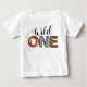 T-shirt för födelsedagsfirande med texten "vild en" i olika djurtryck. Du kan anpassa denna t-shirt genom att lägga till barnets namn under texten!