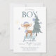 Denna söta anpassade pojke baby shower inbjudan har en akvarell stil vinter skogsillustration. En bild av en hanne kalv, eller baby hjort, är tryckt i mitten, bredvid en tall och fallande blå snö.