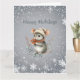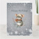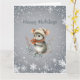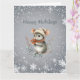 En söt grå mus iklädd vinterdräkt i stickad mössa och halsduk håller bär och önskar dig “God Jul.” Den är omgiven av en vit snöflingedesign. Greetings kan enkelt ändras till vad du föredrar.