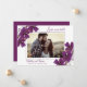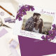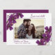 Ett härligt sätt att tillkännage ditt kommande bröllop. Den här snyggten Spara datum meddelande har vackra violetta vattenfärgsblommor i lila med utstrykningspunkt i guld i glitter som passar ditt favoritfoto i bröllop. Fotot har ett filter som kan ändras eller tas bort i verktyg. Lägg till ditt speciella meddelande till familj och vänner på baksidan.