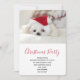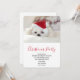 Julfestinladning med en bedårande bild på en söt vit hundvalp som bär en röd julhatt.