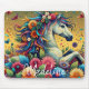 Personlig namn musknapp. Vackra färgade blommor och en söt vit häst. Whimiscal ai art.