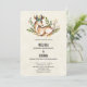 Bröllopsinbjudan med en söt hjort som lägger sig omgiven av lövbar flora.