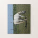 Söt vit häst som äter gräs på gårdspussen. Bild i Wisconson.
