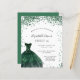 En modern, stilren och glamourös inbjudan till Sweet 16, 16-års födelsedagsfest. På framsidan: En vit bakgrund med gröna gnistor, en smaragdgrön klänning. Namnet är skrivet med en modern handskriven typsnitt. Anpassa och lägg till din festinformation.