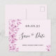 En elegant och enkel Spara datumkortet för en svensk 16:e födelsedagsfest. En chic rosa-bakgrund dekorerade rosa och lila vattenfärgade botaniska blommigtar. Mallar för ett datum och namn/ålder 16. Svart färgad brev. Texten: Spara datumet skrivs med ett stort trendig-handskript i stil. Tips! Om du inte vill att det ska se ut som ett vykort klickar du på anpassa, går till baksidan och tar bort delaren och lägger till frimärke.