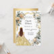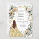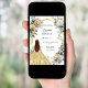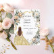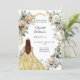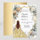En faux guld tittar bakgrund. Dekorerad med vita och gult blommigtar och ett gyllene band. En tjej som bär en tiara och en klänning. Anpassa och lägg till namn och detaljer. Baksida: en faux guld-bakgrund.