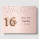 En gästbok för en girig och glamorös sötad 16, 16:e födelsedagsfesten. En faux ro guld-bakgrund med rosa faux-diamanter. Anpassa och lägg till namn och datum. Namn är skrivet i mörk ro guld med ett modernt handskript i stil. Nummer 16 skrivs med ett stil-teckensnitt med ballong.