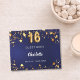 Atrendy navy blue, uneven färgad bakgrund med faux guld-stjärnor. Lägg till namn och text. Åldersnumret skrivs med ett stil-teckensnitt för ballong. Rygg: lägg till texten.