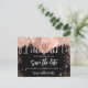 En svart bakgrund som dekoreras med droppar, gnistor och ballonger i ro guld faux glitter. Anpassa och lägg till datum och namn/ålder. Texten: Spara datumet skrivs med ett stort trendig-handskript i stil.