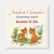 En julfest sparad datum magnet med en förtjusande teckning av ett par rävar med en vänlig fågel i närheten. Omgiven av järnek och tallkottar och annan vintergrönska.