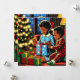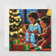 En söt popkonst retro scen med söta små barn med olika hudfärger som öppnar sina julklappar på julmorgonen. Denna illustration förmedlar en nostalgisk känsla av upphetsning och glädje och kommer att väcka alla de goda minnena från tidigare.