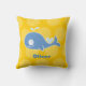 Söt, tecknad blå val på en ljusgul bakgrund med stora, feta prickar, dekoration för barnkammare, personlig kastkudde med barnets namn.