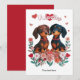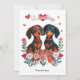 Överraska någon speciell med detta söta Alla hjärtans dag-kort med två söta dachshundar, omgivna av lekfulla hjärtan, blommor och ordet "Valentine" högst upp. Den charmiga designen med korvhundar fångar värmen och tillgivenheten på helgdagen på ett roligt och lekfullt sätt. Personifiera kortet med ditt eget meddelande nedanför bilden, vilket gör det till en extra speciell souvenir för din älskade. Perfekt för doxie-fans och andra hundälskare, kommer detta kort garanterat att glädja på Alla hjärtans dag.