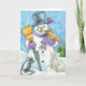 Vintageillustration God jul juldesign med söta tecknade skogsdjur som bygger en snöman på vintern. Snömannen håller en kvast, har en sjal och en topp hatt. En ekorre lägger till en klump kol till hans mun, en skunk lägger till mer snö till hans kropp, en kanin rullar en snöboll medan en röd fågel sitter på hans hattkant.