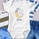 Den här bedårande barnkroppen har en charmig halvmåne med en söt, sömnig leende, omgiven av stjärnor. Den drömska pastellfärgspaletten i babyblått, lavendel och blekgult skapar en lugnande stämning.