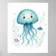 En charmig illustration som visar en blå manet omgiven av vänliga fiskar och ömtålig grönska. Detta konstverk är perfekt för att lägga till en touch av undervattensmagi i valfri utrymme