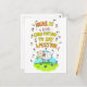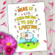 Bakgrunden på detta kort är vit. Uppifrån och ned är skrivet "Här är ett litet kort till dig för att säga att jag saknar dig". Bokstäverna är handritade och gula och orangea. Orden är inramade med små rosa och lila blommor.