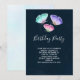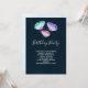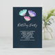 Födelsedagsinbjudan med en delikat feminin design. 3 akvarell fjärilar, målade rosa, lila och gröna. Mörkblå akvarell bakgrund.