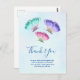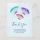 Tack-kort med en delikat feminin design. 3 akvarell fjärilar, målade rosa, lila och gröna. En ljusblå akvarell bakgrund med antydningar av ljust rosa.
