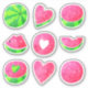 Söt och färsk sommardekal. Ljusa vattenmelonskivor, hjärtan och frön. Rosa och grönt färg.