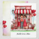 Personalisera din Alla hjärtans dag för honom eller henne på detta söta platta vykortet tryckt med en bedårande duo och deras tokiga lilla butiksscen fylld med massor av små hjärtan, ballonger och blommor detaljer. Redigera dina namn, initialer och annan text fram och bak. Vattenfärg stil illustration har en abstrakt pastell bakgrund fram och bak. Skapad i en palett av mestadels röda och rosa färger, med ditt val av storlekar.