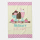 Personlig kökshandduk med ett sött glasstema. Rosa diagonalt rand längs överkanten och grund gräns. Illustrerad med chokladglass pub, 3-skopsskåp med körsbär på ovansidan och jordgubbsbär flyter med vispgrädde. Små jordgubbar och körsbär längs grund. Blekens gult - bakgrund. Uppfräschning av hettens väder tar.