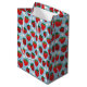 En ljuv repetering mönster av juistjordgubbar och växtens vita blommor sprids över en himlar blå bakgrund. Den här presentpåsen är ett roligt som tillägg till din presentpaketering för födelsedags- och duschpresenter samt sommartid i firande och party.
