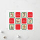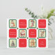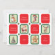 Söta julbilder i enskilda gröna rutor som alternerar med röda rutor som var och en har olika julhälsningar. Bilderna är en snöman, en randig julstrumpa i pepparkaksrandigt mönster, en tomte, en ren, ett dekorerat julträd och en pepparkaksfigur. Alla julhälsningar kan enkelt ändras till valfri hälsning. Texten på baksidan kan också enkelt ändras eller raderas om du vill skriva ditt meddelande för hand.