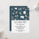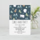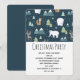 Jul fest inbjudan med ett fantasifullt festligt mönster. Isbjörnar, renar, träd, rävar och snöflingor. På en mörkgrön bakgrund.