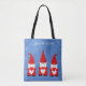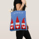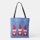 Tre julgnomar och snöflingor på himmelsblå shoppingbag. Texten kan anpassas.