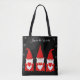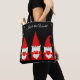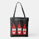 Tre julgnomar och snöflingor på svart totebag. Texten kan anpassas.