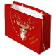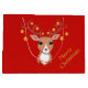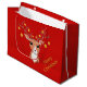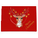 Söt julhjort i mitten på röd bakgrund presentpåse. Renarna är dekorerade med gyllene bollar.