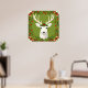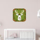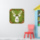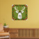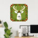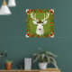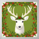 Detaljerad illustration av en hjort med horn i ett lugnt, snöigt landskap med grönska och svamp.