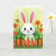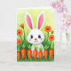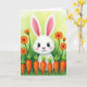 Det här kortet visar en stiliserad vit kanin som tittar upp från en tjock yta av smaragdgrön gräs, med ansiktet och övre delen av kroppen centrerad som om den lutar sig in för en vänlig hälsning 🐰. Framför kaninen ligger sju prydligt uppradade orange rotfrukter med gröna bladtoppar i en snygg liten rabatt som känns som ett delat ögonblick mellan kaninen och betraktaren. Kaninens stora blå ögon, lilla rosa näsa och rosiga kinder ger den ett ömt och tillgiven uttryck, som om den är tyst nöjd över att se någon särskild. Höga öron reser sig ovanför huvudet med mjuka rosa detaljer på insidan, vilket ger scenen en mjuk och mysig känsla. Bakgrunden tonar bort mot en blek, solbelyst grön tvätt, vilket håller fokus på kaninen och trädgården samtidigt som den antyder en lugn vår morgon. Små varmt orange blommor med stjärnformade kronblad och djupare röda centra prickar grönskan, som glada toner inklämda i landskapet 🌷. All välkomsttext skulle passa