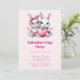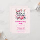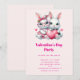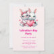Valentinsdagsinbjudan med en illustration som visar 2 vita luddiga kaniner som delar ett stort rött hjärta. Flickkaninen har en söt rosett på huvudet och hjärtformade glasögon. Pojkkaninen är klädd i en bedårande liten kostym med slips.