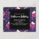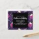 Halloween FÖDELSEDAGSfest inbjudan med ett förtjusande halloween-tema mönster. Katter i häxhattar, sittande på rosa pumpor med lila spindelnät i bakgrunden.