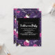 Halloween-inbjudan med ett förtjusande Halloween-tema mönster. Katter i häxhattar, sittande på rosa pumpor med lila spindelnät i bakgrunden.