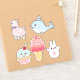 Tecknad serie-ark med klistermärken med söta Kawaii-figurer som en lama, val, kanin, cupcakes och en glasskon.