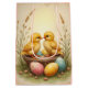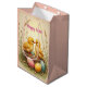 Denna anpassade presentpåse har ett underbart påskmotiv i nostalgisk vintage-stil - söta kycklingar och färgglada påskägg i en korg, ogräs, suddig bakgrund. Vackra färger i gult, blått och rosa. Vacker för dina påskpresenter!