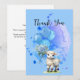Skicka en hjärtlig tacksamhetsnotis med detta eleganta 5x7 platta tackkort, en del av vår Sweet Little Lamb baby shower-kollektion. Med en mjuk akvarell-lamm omgiven av ömtåliga blå hortensior och pastellfärgade ballonger, ger detta kort en söt och genomtänkt touch till din tacksamhet.