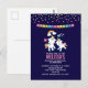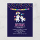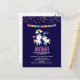 En fantasifull och flickig födelsedagsinbjudan. Designad med 2 söta enhörningar med ljusa och färgglada svansar och man. En färgglad regnbåge med moln på varje sida ovanför deras huvuden. Andra element inkluderar en liten blomma, ett hjärta och några stjärnor. Längs toppen finns färgglada, livfulla konfettipunkter. Bara en bild, inte faktisk konfetti. En flaggbanner sträcker sig över toppen. En mörklila bakgrund.