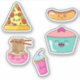 5 utstansade dekaler med Kawaii stil pizza, varmkorv, cupcakes, ramen nudlar och en dryck. Varje bild går att skala av separat. Perfekt för klotterdagböcker, scrapbooking och restaurangmarknadsföring.