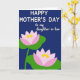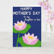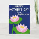 Denna design visar en djup indigofärgad bakgrund som känns lugn och intim och sätter scenen för ett sött meddelande på mors dag ❤️. Nära toppen sitter huvudraden ”HAPPY MOTHER'S DAY” centrerad i vitt, med en rundad och lättläst stil som sticker ut tydligt. Strax nedanför visas ”to my daughter-in-law” i mindre storlek med en mjukare vit färg, skriven med flytande, kursivliknande bokstäver som ger en mjuk och tillgiven känsla. Den nedre halvan visar två stiliserade vattenliljeblomor som är diagonalt vinklade, som om de lutar sig mot varandra i tyst närhet. Varje blomma vilar på breda gröna blad, med kronblad som bleknar från rosafärgad vid kanterna till starkt vitt mot mitten. I mitten av varje blomma lyser varma gula detaljer som små solbelysta gnistor 🌼. Kompositionen hålls enkel med tydliga former, och de två blommorna sitter lite isär men är visuellt sammankopplade mot det rika blå f