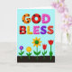 Denna gratulationskort har en digital illustration med den stora, tvåradiga texten ”GOD BLESS” centrerad nära toppen i fylliga, tredimensionella bokstäver som känns lika söta och vänliga som delade godsaker ❤️. Orden vilar på en mjuk ceruleanblå bakgrund, vilket ger budskapet gott om öppet utrymme att andas. Varje bokstav har sitt eget dekorativa mönster: varma orange och djupröda bokstäver bär svarta prickar, medan soliga gula och rosa bokstäver är strödda med små röda fläckar som konfetti. En djupviolett bokstav är prickad med mörkare fläckar, och det röda ”S” i slutet sticker ut med tunna vita stygnliknande linjer som antyder omsorg och närhet. Under texten sträcker sig en mörkbrun remsa av mark över botten, likt en enkel rabatt redo för en liten fest. Från denna jord stiger fem stiliserade blommor på smala gröna stjälkar, vars former lutar mot varandra på ett mjukt och