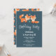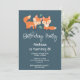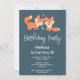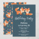 Födelseinbjudan med en grafisk illustration av 2 orange rävar som ser söta och glada ut.