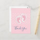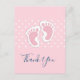 Tack-kort med en förtjusande bild av rosa babyflickas fotspår med vita prickar på en rosa bakgrund bakom illustrationen.